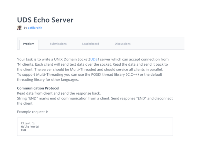 Unlike fundamental algorithm challenges, knowledge-based code challenges are much more straightforward because they’re dependent on knowledge of a particular domain or technology. For instance, challenges based on Client-Server, Sockets, Multi-threading are good signals of seniority in distributed systems. We asked Dr. Memelli to offer a great example of a knowledge-based code challenge: