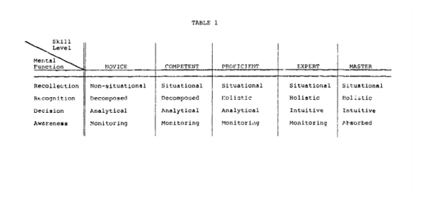 - Dreyfus & Drefyus break down the levels of skill versus mental function.