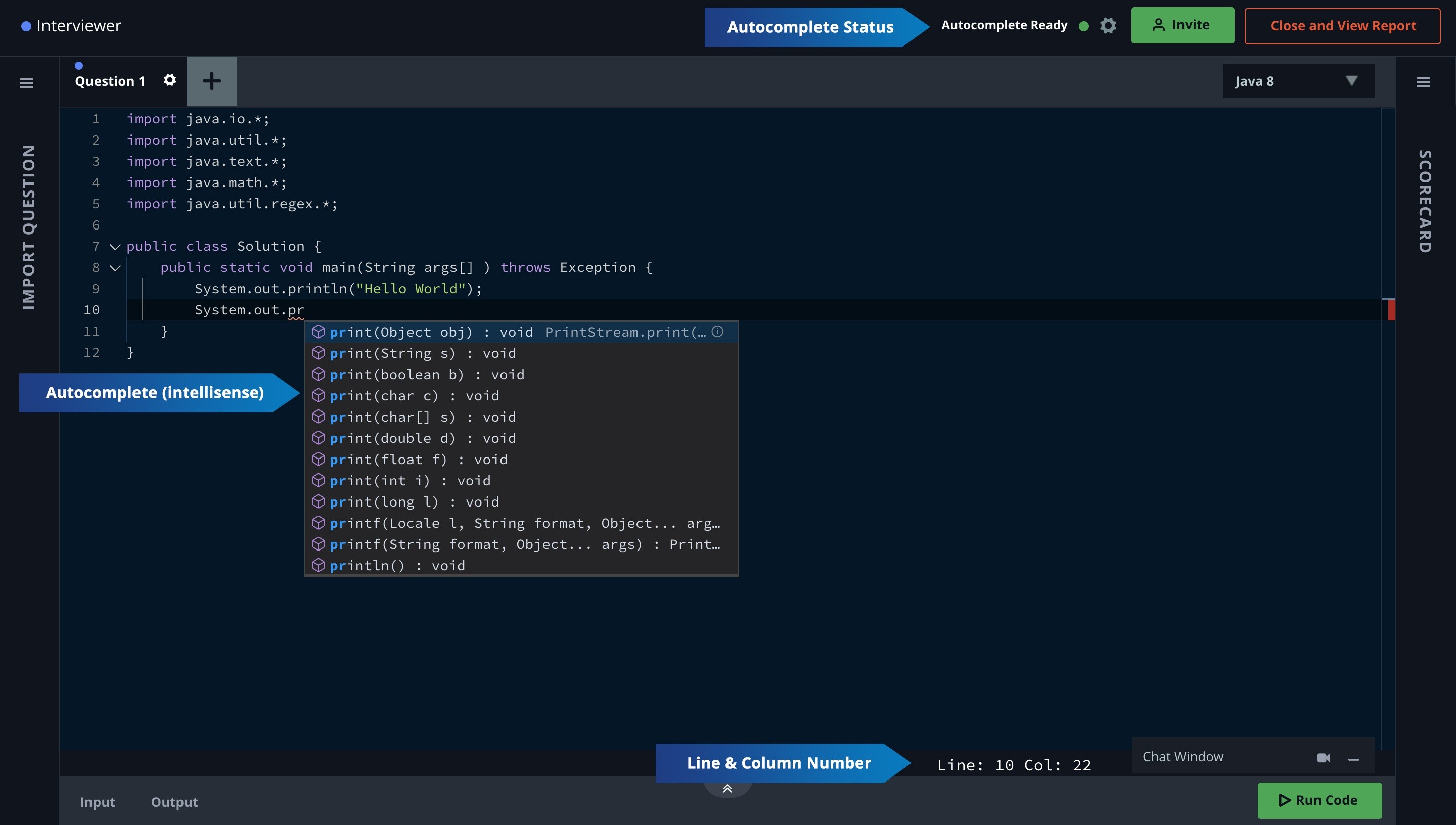 The combination of these features enables a more proficient programming experience by reducing keystrokes and highlighting errors, resulting in a better experience for candidates and interviewers alike.