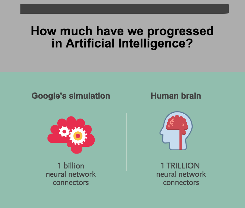 The largest neural nets have about a billion connections, up from 1,000 times the size of a few years ago. Objectively, we’ve reached impressive milestones in AI through deep learning (or artificial neural networks), but we’re still worlds away from replicating the human brain: